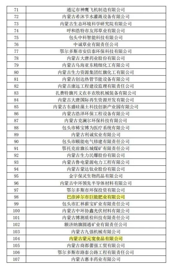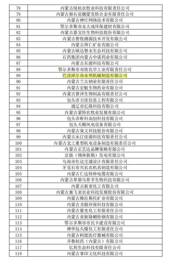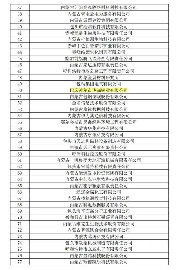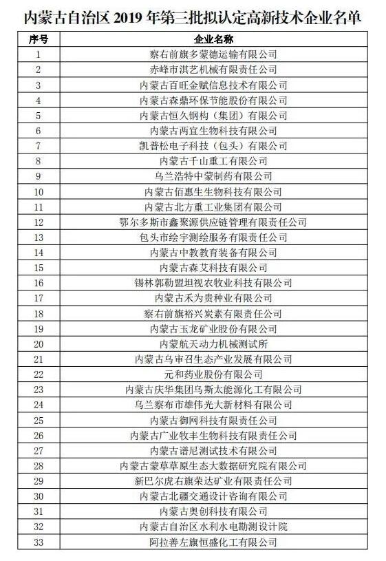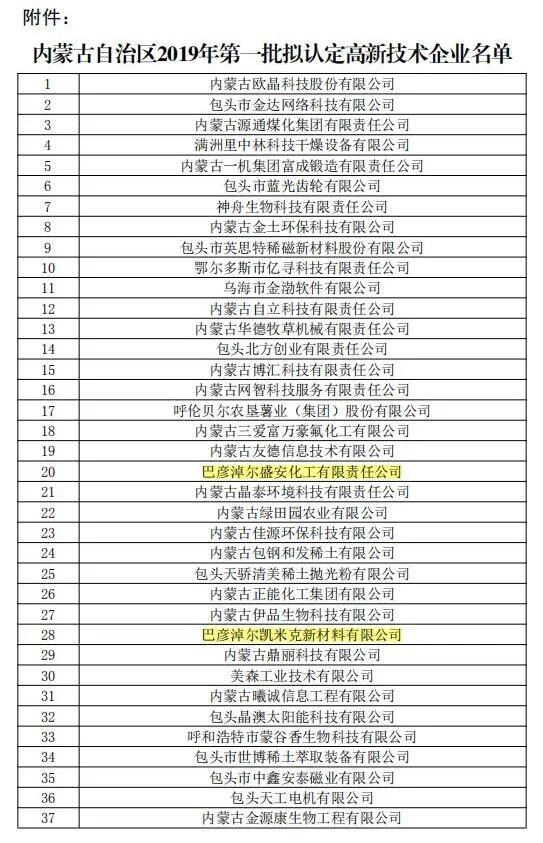 近日,全國高新技術企業(yè)認定管理工作領導小組辦公室分三批下達了內(nèi)蒙古自治區(qū)2019年高新技術企業(yè)備案名單,巴彥淖爾市草原晶鑫食品有限公司、蔚藍網(wǎng)絡科技有限責任公司、美洋洋食品有限公司等13家企業(yè)被新認定為我國高新技術企業(yè)。截至目前,全市共有高新技術企業(yè)51家。