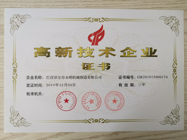 永明機械被自治區(qū)政府、科技廳認(rèn)定為自治區(qū)企業(yè)研究開發(fā)中心,并獲批為自治區(qū)高新技術(shù)企業(yè)。這兩項榮譽的獲取,證明了永明機械在技術(shù)領(lǐng)域的投入與突破。