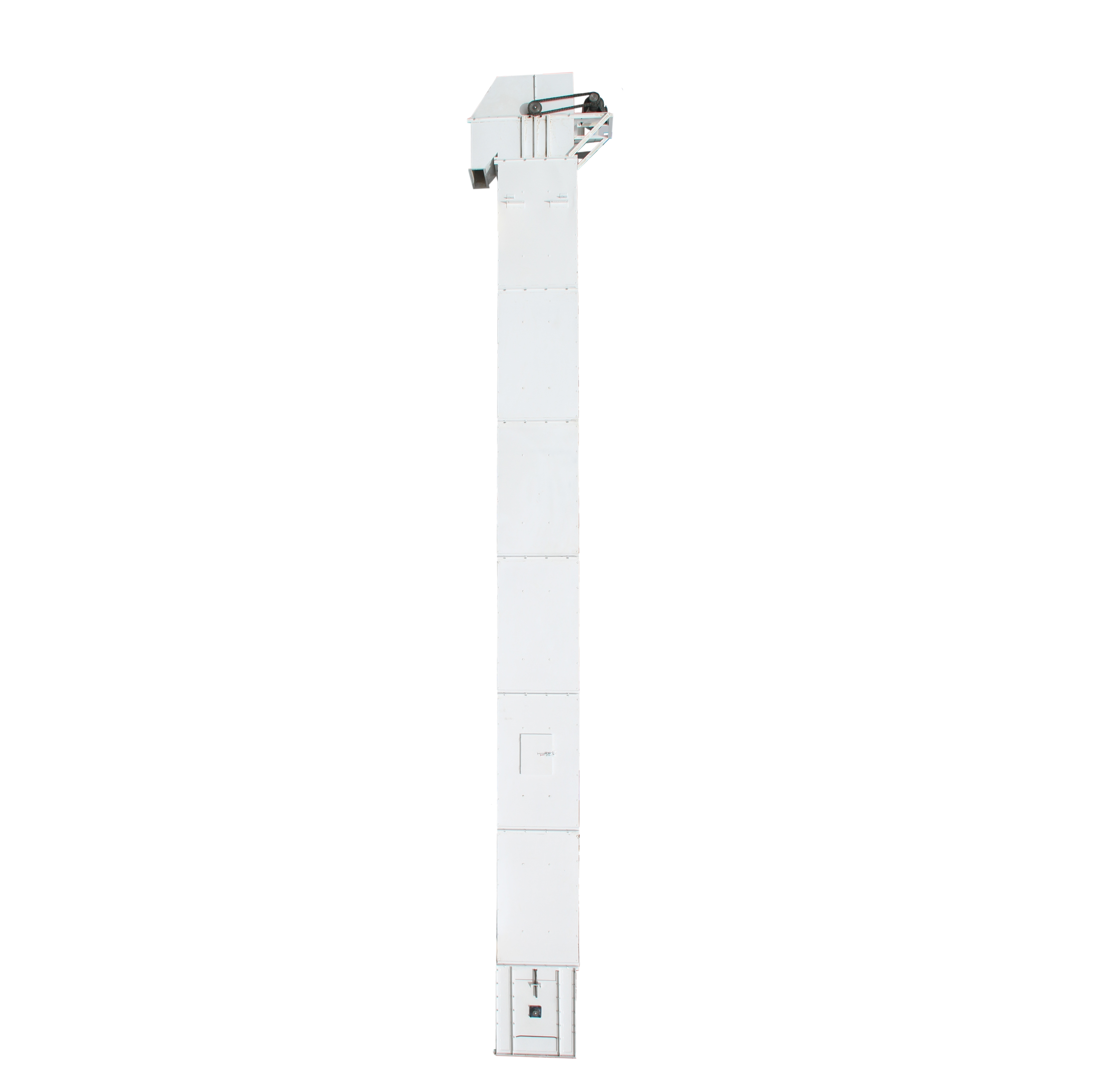立式提升機是垂直提升物料的有效設(shè)備之一。本機適用于谷物、種子、肥料等顆粒狀物料的提升。立式提升機由皮帶和多組參斗組成,設(shè)備頂部和底部裝有輥輪。參斗經(jīng)皮帶轉(zhuǎn)動通過入料口時,物料由于重力作用自動流入畚斗內(nèi);當(dāng)參斗經(jīng)皮帶轉(zhuǎn)動到達(dá)設(shè)備頂部,物料再由重力作用流向出料口;該機結(jié)構(gòu)靈活,無論是機身高度、畚斗寬度、設(shè)備材質(zhì)都可滿足不同客戶的定制需求,該設(shè)備加裝了電機防雨罩、鏈條防護(hù)罩以及檢修平臺,很大限度的保障了設(shè)備的耐使用性以及易維護(hù)性。本設(shè)備可加裝上料平臺成地坑料箱,在保證較大化物料提升量的同時,也保證了較小的物料破損率。