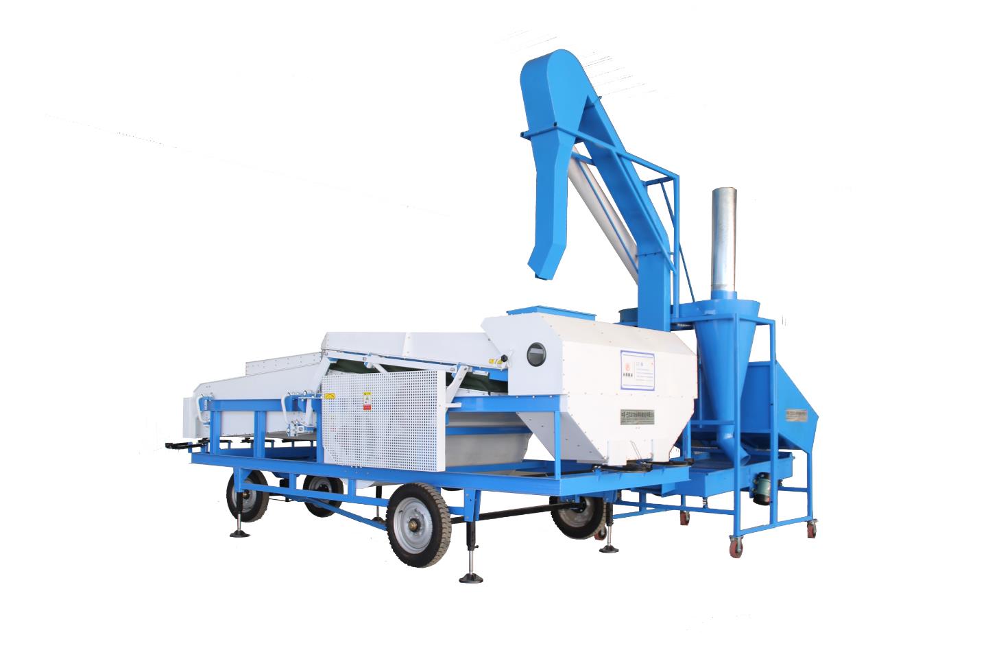 5XF-2000型復(fù)式清選機(jī)是一款結(jié)合初選和分級的糧食加工設(shè)備,主要用于經(jīng)濟(jì)作物的篩選作業(yè)。該產(chǎn)品利用四組特定篩片,篩選出不同的生態(tài)雜質(zhì),土塊,石子,不良作物(癟籽、不籽),同時選出不同大小的成品原料。原料進(jìn)入比重臺,通過正壓懸浮,大雜和氰籽向后移動進(jìn)入集中箱出料口,成品原料向前移動講入分級飾,物料通過信口擁動沿各層飾而前行進(jìn)行分級,同時共除過大成過小雜質(zhì),將大、中、小料分類出料,篩片的大小可根據(jù)客戶需求定制選裝;利用彈力球解決篩網(wǎng)堵塞問題,并且通過比重臺和分級二次工序達(dá)到篩選效果。此外,為提高產(chǎn)品選別效率,該機(jī)還配備了風(fēng)運(yùn)提升機(jī)來進(jìn)行原料提升,該風(fēng)運(yùn)原料提升機(jī)由小型振動篩和旋風(fēng)除塵器兩部分組成,本設(shè)備主要有除雜、去石、提料、除塵等功能。